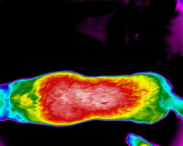 The thermographer will take thermal images with our infrared camera during a wellness check. We then analyse those images for thermal symmetry and critical points of hyperthermia and hypothermia; this provides a clearer understanding of where our patients are suffering a level of disease or dysfunction such as; pain, injury from equipment use, overuse of muscles, restricted blood flow, etc.